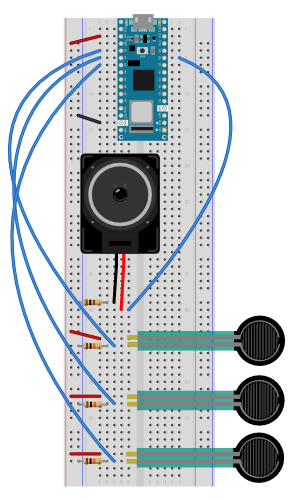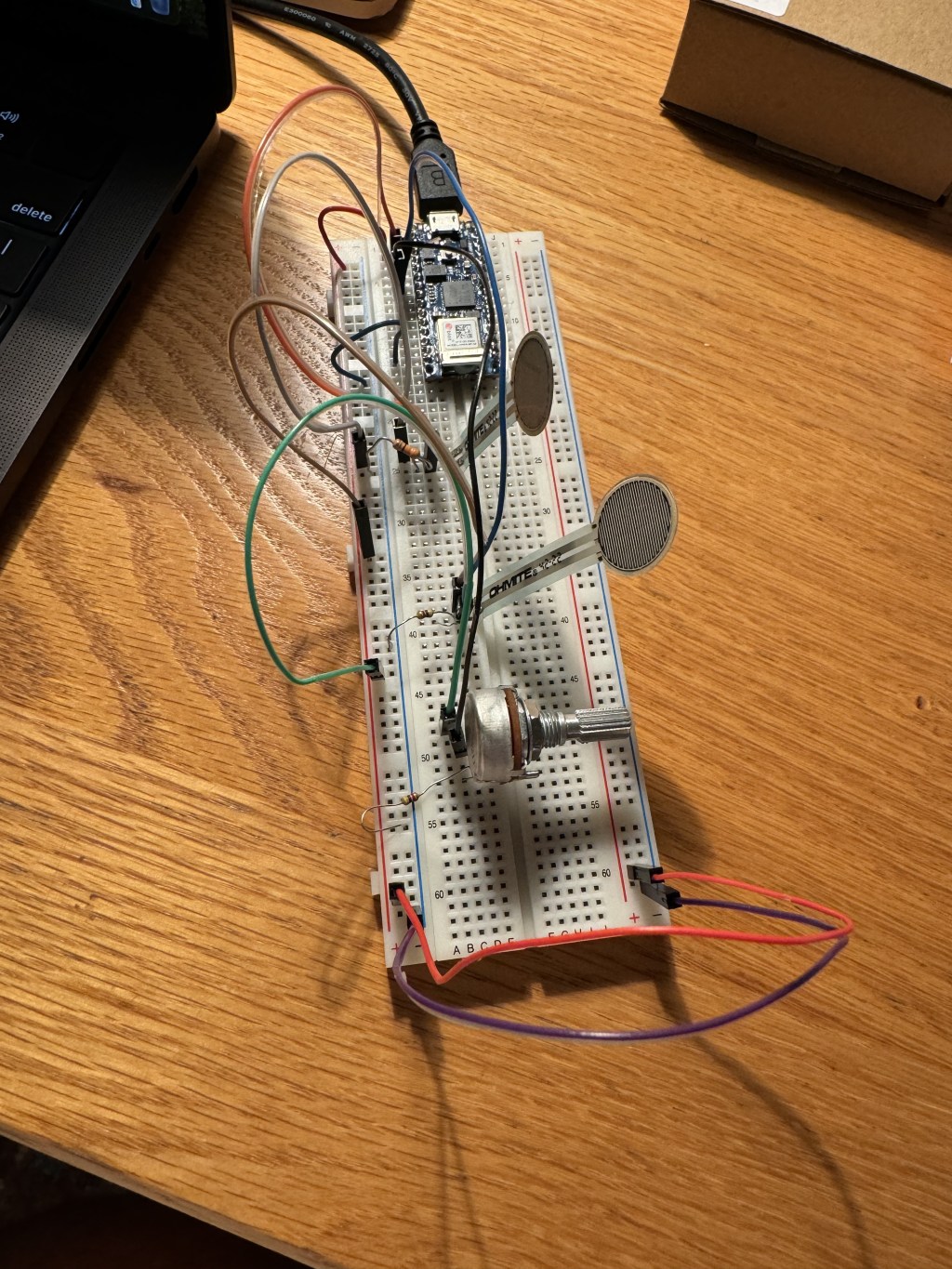Then, I added the potentiometer and upped the threshold since the potentiometer’s values started higher than the FSRs. As a result, I got a working keyboard of sorts!