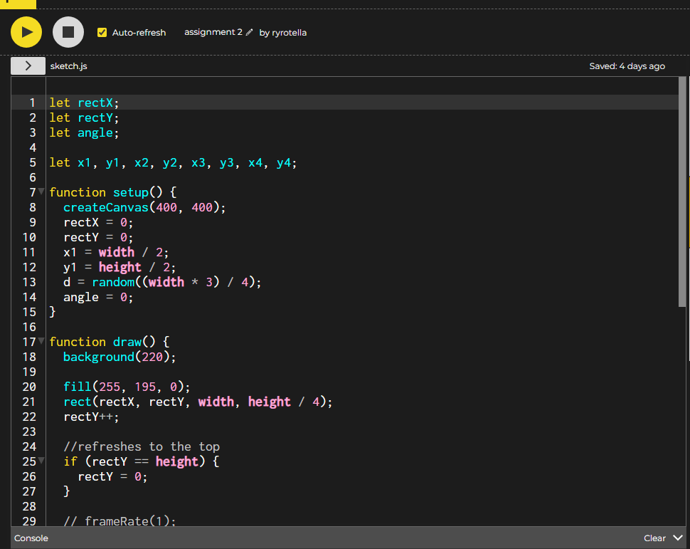 In this week’s Intro to Computational Media assignment, we learned the importance of refactoring code to make sure it’s clean and readable. I chose my assignment 2 p5 sketch, which looked like this in the code.