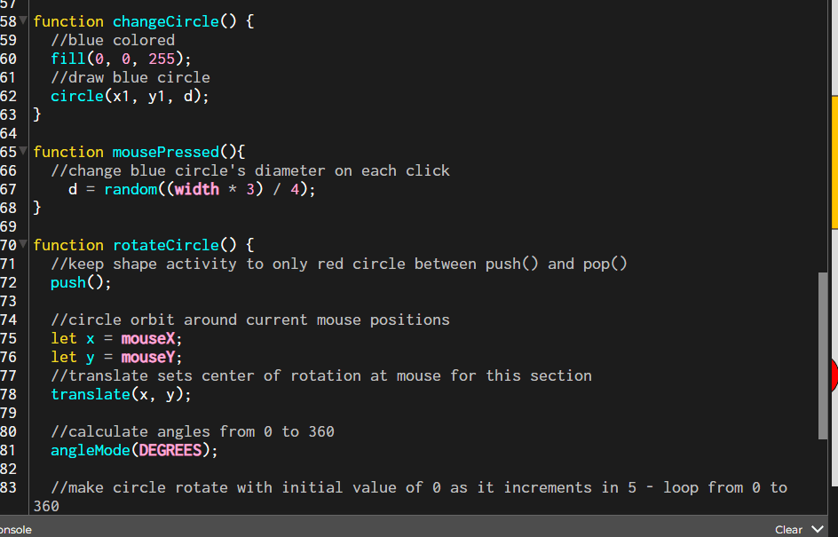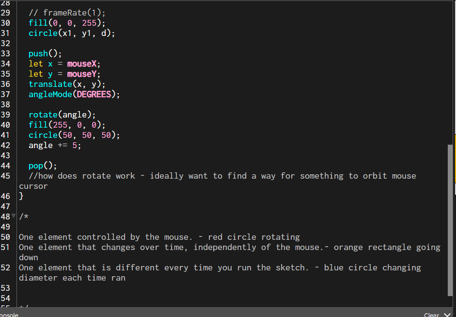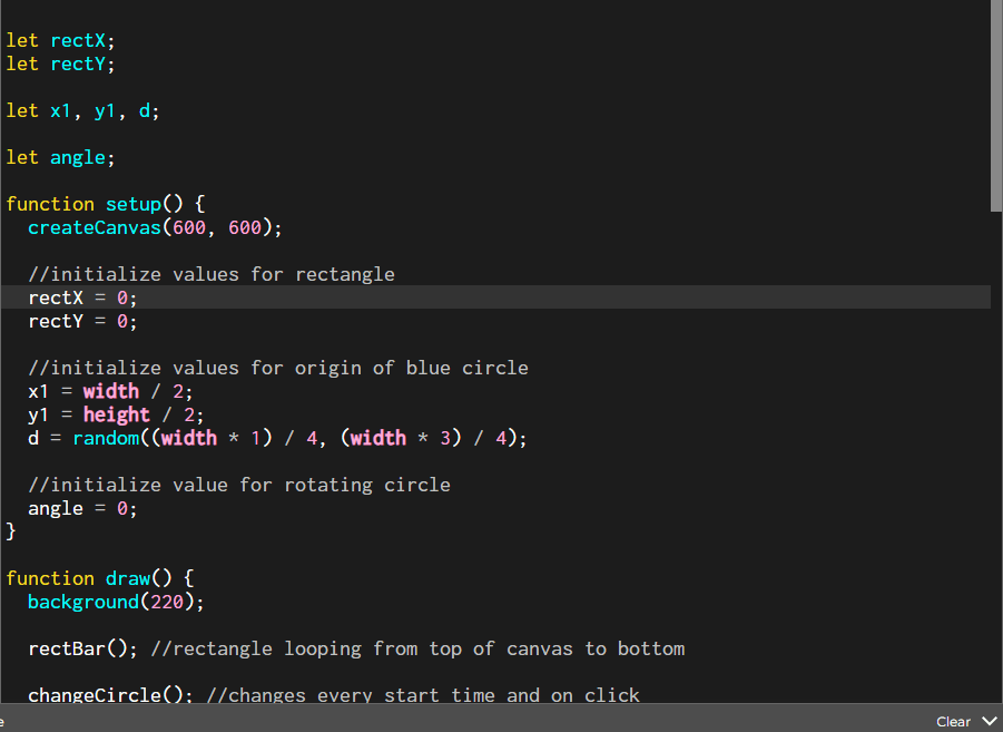 I got rid of all unused variables, separated functions out, and even added a mousePressed function to improve the interaction of changing an object’s size. The tidiness of the code makes me feel better. I noticed that in other people reviewing my code on the floor. The tidiness of the code made them feel more pleasant about my sketch.