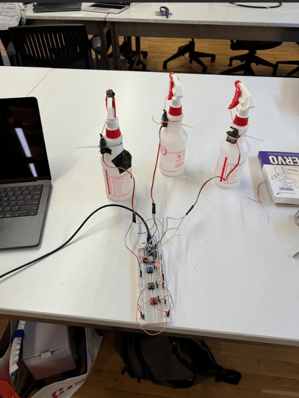 After some further building and figuring out the best way to attach the wires and servo, I now have three functional automatic sprayers with the press of some buttons.