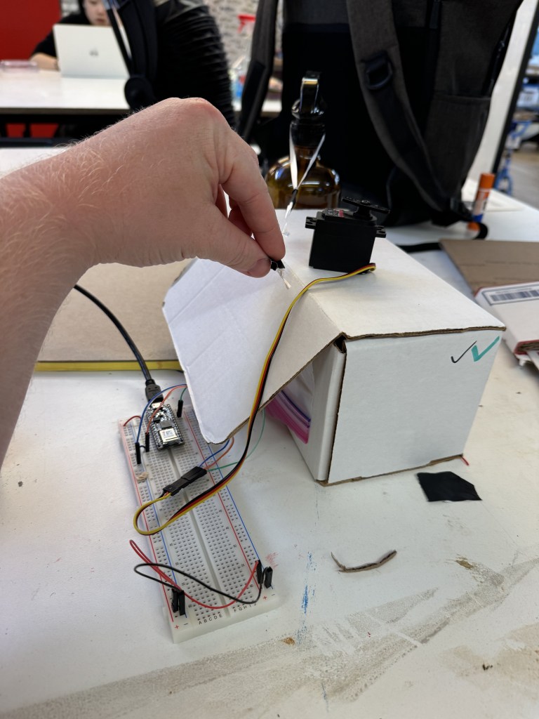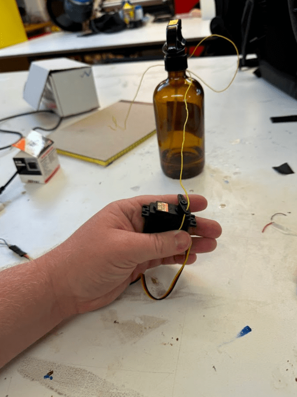 Since Runqi and I have pivoted to having “ghosts” that sneeze/spray at people, I started with trying to figure out how to get a servo to spray a bottle.