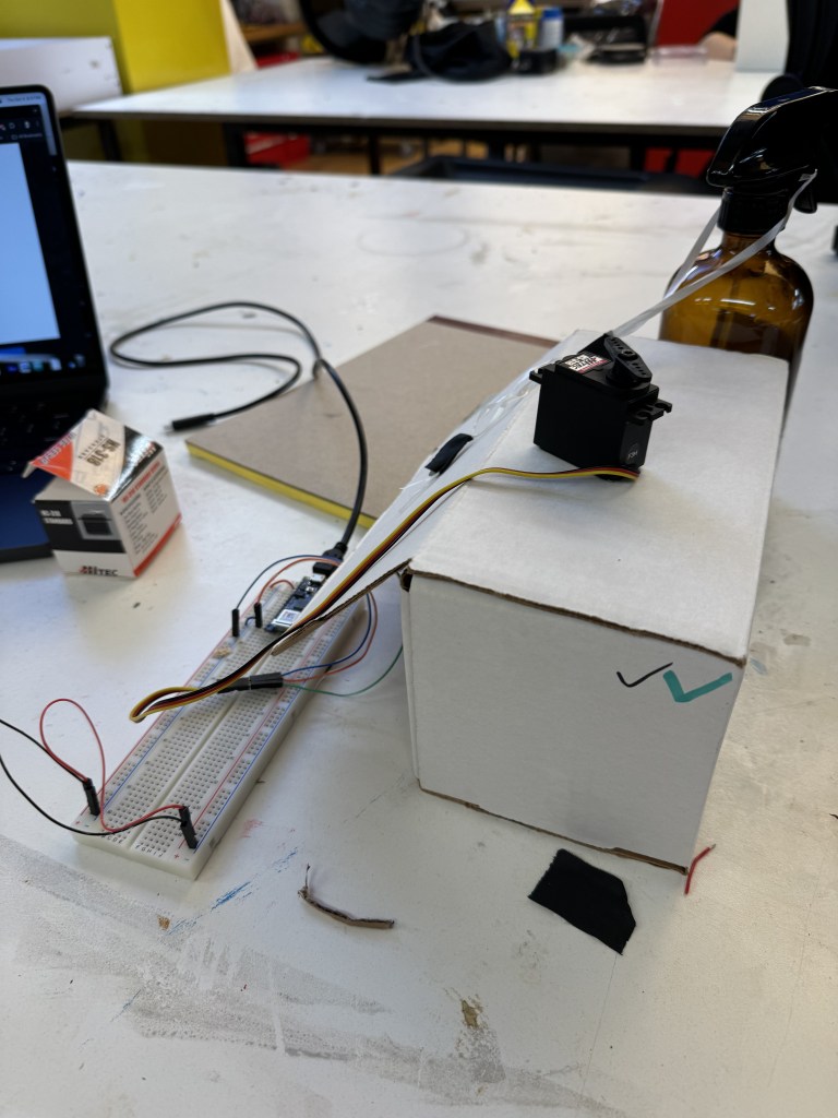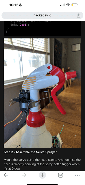 Inspired by this design, I worked to attach a micro servo with ziptie to the bottle and tie some string around the trigger of the spray. Unfortunately, the string was too weak and broke when pulling the trigger. Therefore, I wrapped electrical wire around the spray trigger and voila!