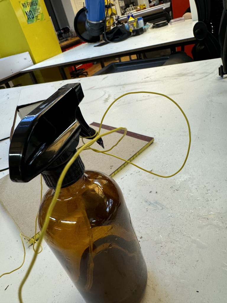 At first, I tried tying a ribbon to the spray bottle trigger and then tying the other end to the servo. Unfortunately, I overestimated my proficiency with knots and the ribbon broke when trying to pull the trigger. So, I tried using wire as that was sturdier.