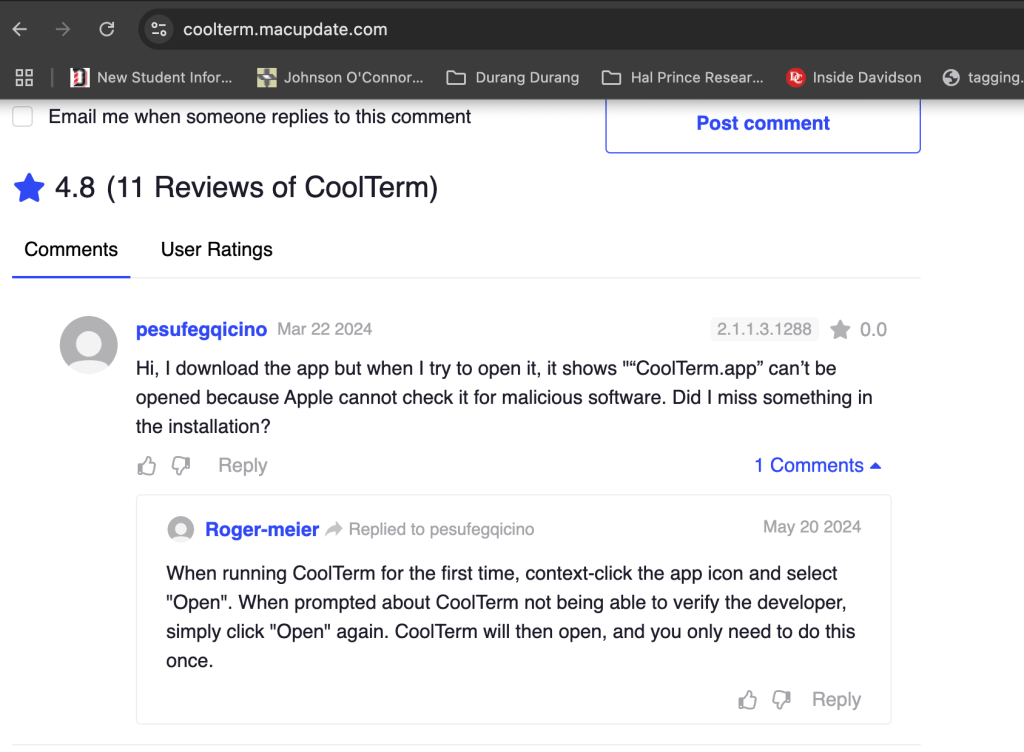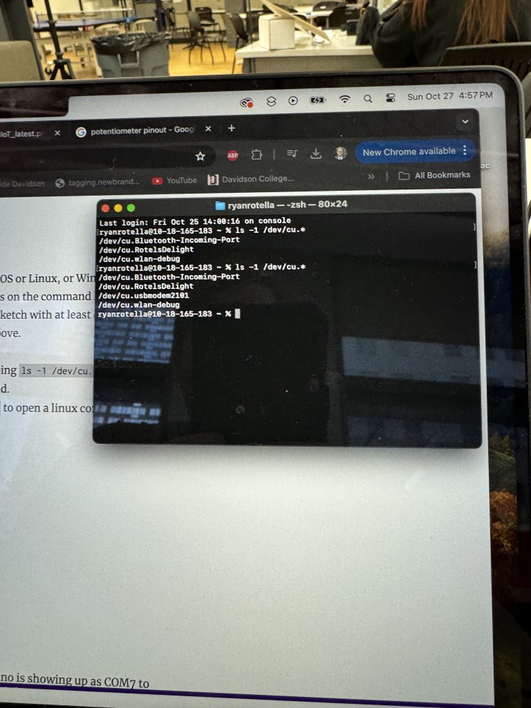 I was curious on how best to tidy up data when it’s received serially. I liked the comma separation, but I wonder how complicated it is to add more strings for labeling? Or I suppose that might mess up the raw data, so I will trust the tab, return, and newline. The software CoolTerm also helps with the presentation a lot. It took a little while since my Mac would not open it at first. However, I eventually found the answer in a comment section from Roger Meier.