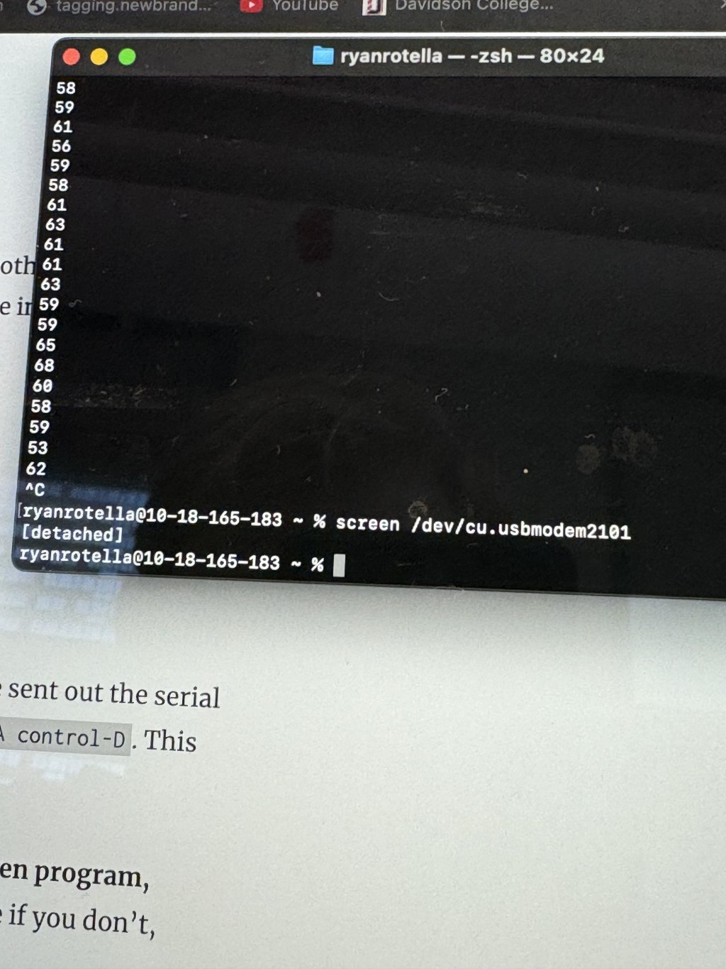 As a reprieve from our midterm work, I enjoyed digging deeper into how our computer and other computers can interact with microcontrollers. This part of the lab was a straightforward setup of how data gets communicated serially.