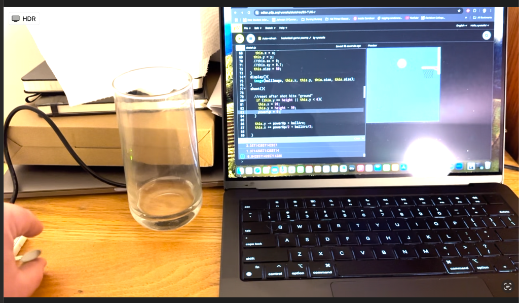 It’s not perfect. I need to build upon the P5 code more to give the basketball a falling arc and see if it goes in the hoop or not. I would like to build more graphics for success or failure as well as color changes and stats, but for now, here is my prototype.