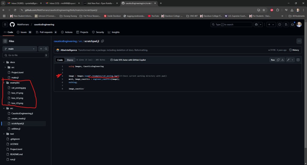 Surya and I met again. We tackled Matt’s code, and I copied his Github to my computer. His code ran in Julia, which I had to download on my machine. The only changes we had to make to his code were: clearing out the images in the Examples folder and replacing with our own image; and replacing references to that image file in the different code files.