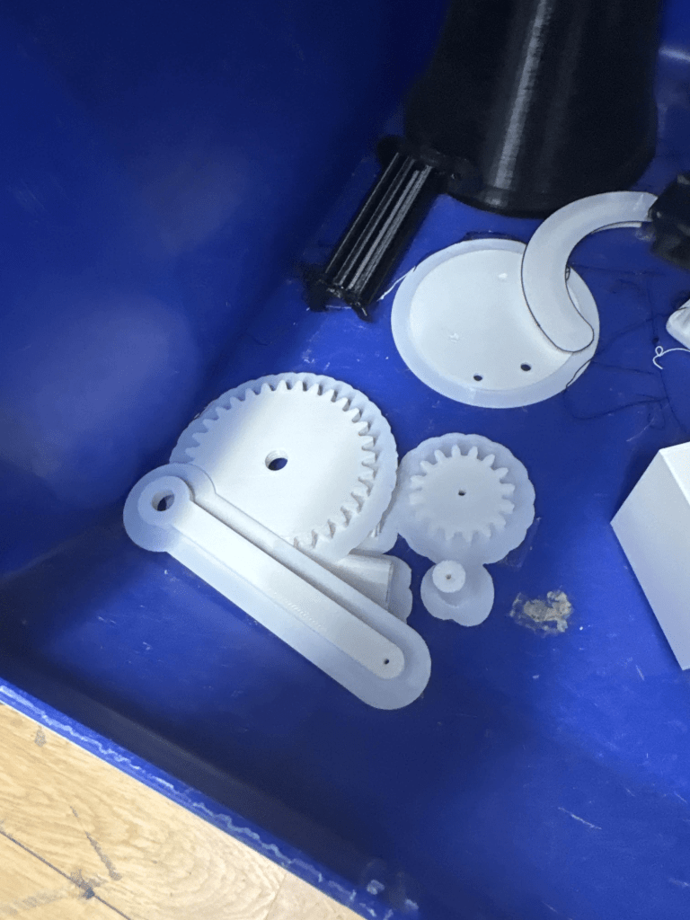 However, the side cases we 3D printed could not contain our project properly. There were too many new elements of nuts and bolts to adjust our design for 3d printing, and the cases needed to be thick and therefore could not be laser cut from thinner material like our gears.