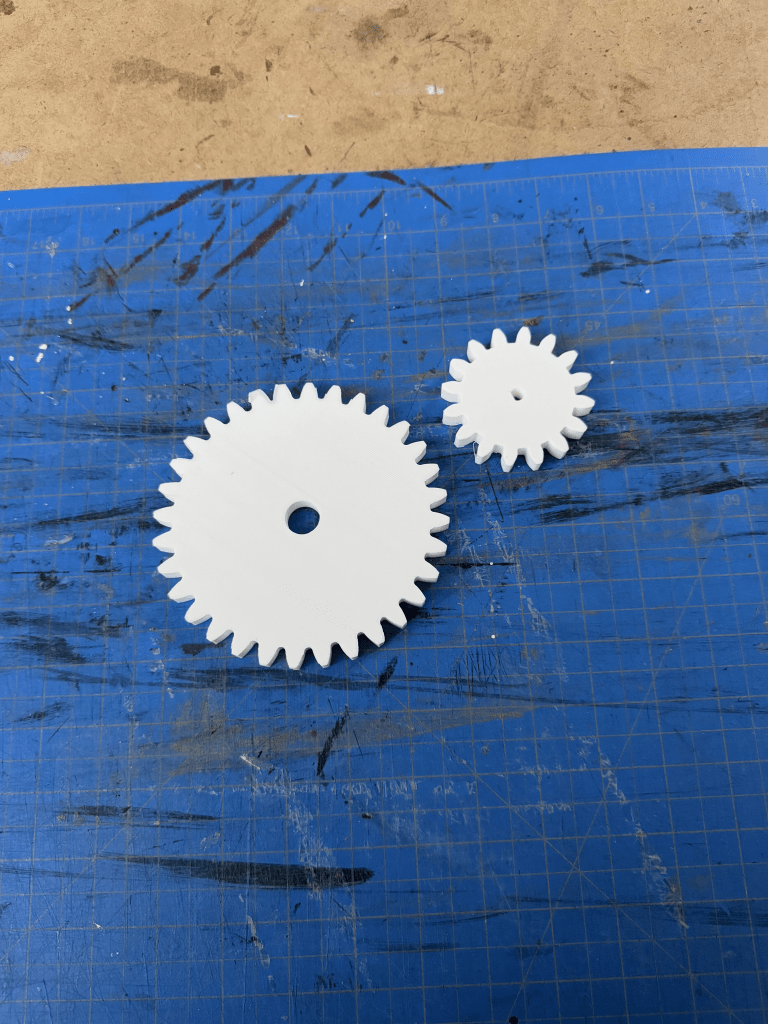 Even though we figured out the laser printer was better, we still opted to 3D print the big gear and casing sides. This was fine for the big gear because it was going around a threaded rod and nuts/washers I acquired at Home Depot, thanks to the guidance of a kind worker there named Kirill.