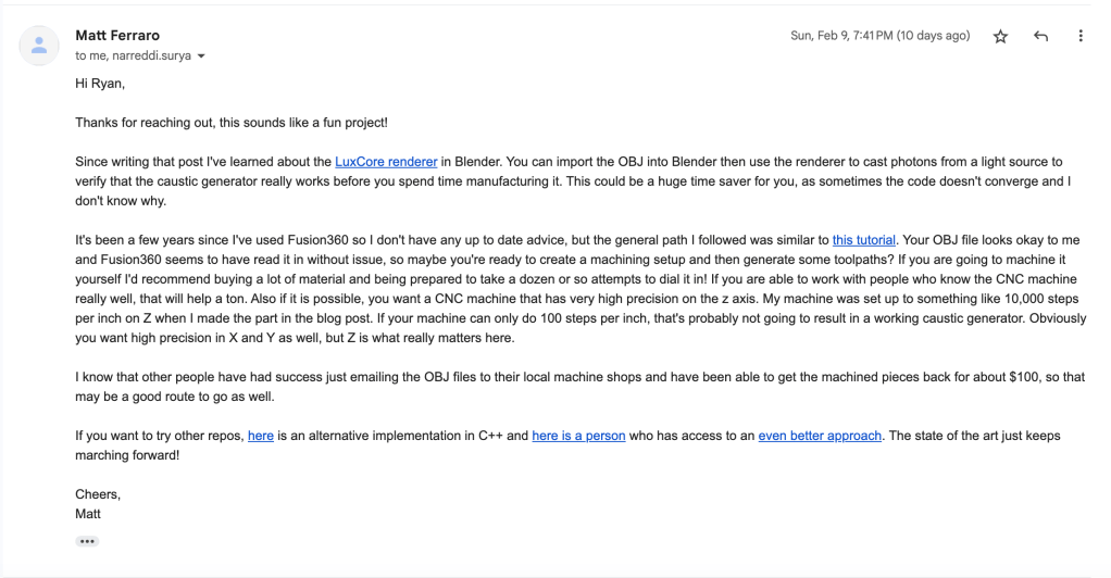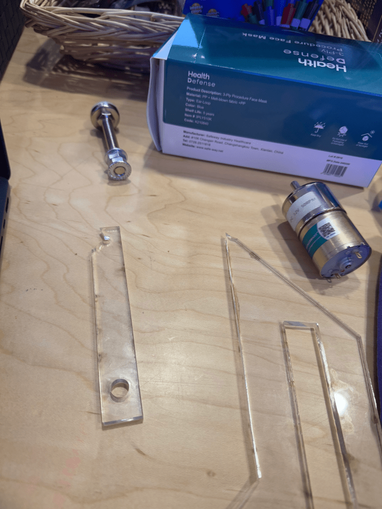 Currently, we’re working to 3D print the handle (the acrylic we’ve laser cut has snapped), wire the motor and light together (quick soldering, probably need a good resistor, possible rectifier circuit), and secure everything, including our lens (our crown jewel), to a wooden base.