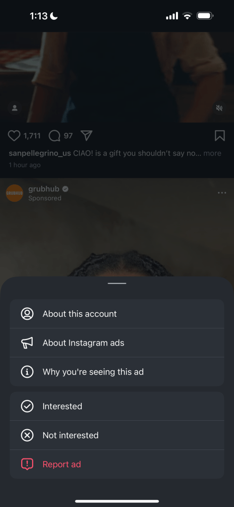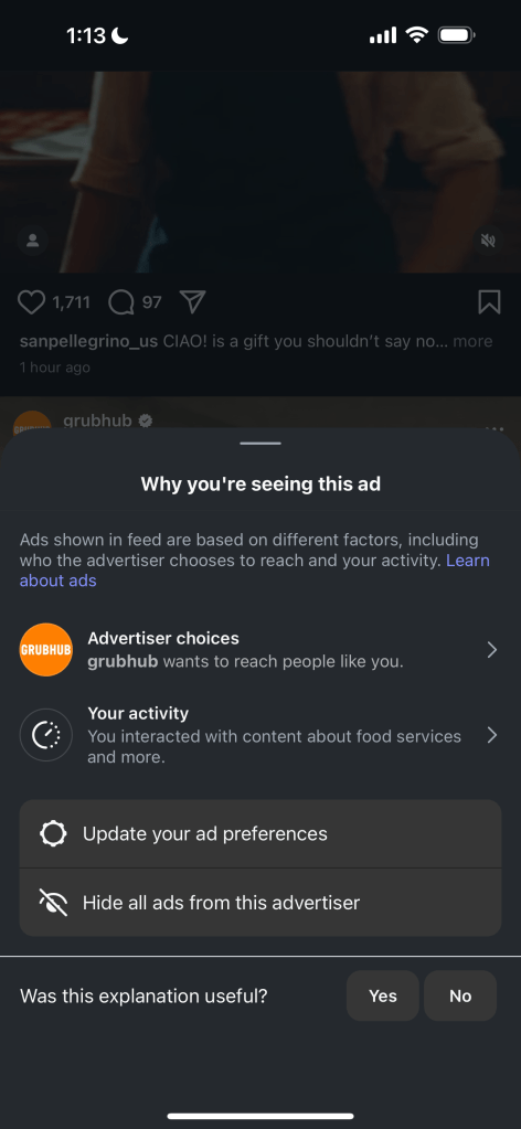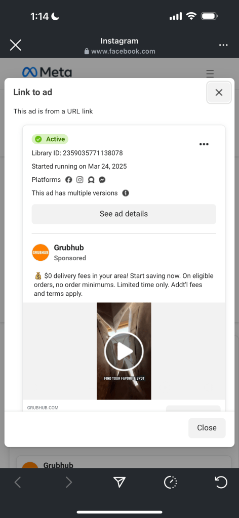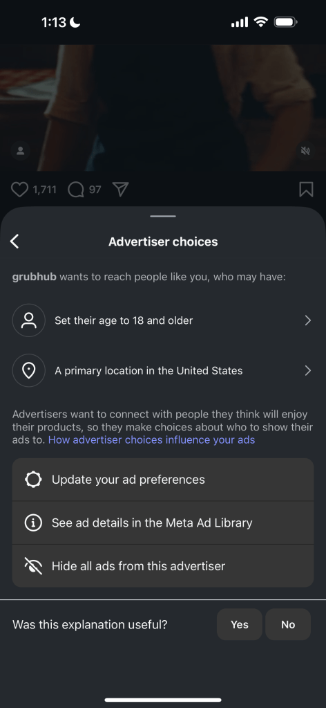 After clicking on why “grubhub wants to reach people like [me], ” I find that it’s because I’m older than 18 and I’m in a “primary location in the US.” That is the most generic and opaque reasoning to serve a Grubhub ad to me, when I suspect the more likely reason is because I’m a graduate student who’s used Uber Eats a lot more since moving to NY. I’m sure Meta has that data from Uber Eats or American Express.