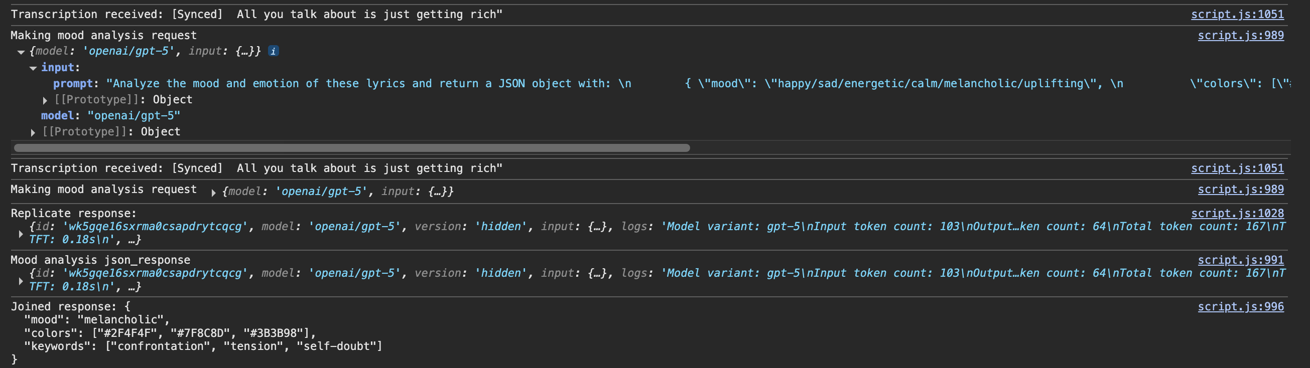 Then, the lyrics get sent to GPT-5 for it to analyze the mood, and it returns a response on its mood, the associated colors with the mood, and keywords from the analysis. The code then paints the canvas with these color as soon as the request gets processed. The model is painting the scene of the song as I am also listening to it, painting it in my own mind.