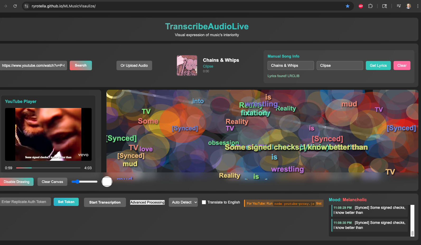This is what motivated my coding experiment for this week. I have an experience where people input a song, either as Youtube URL (which audio can be easily extracted from their API; I recommend this approach) or an uploaded file. Then, you can look up the song’s lyrics by combing a lyric database. The code then syncs the lyrics written on the canvas with when the lyrics are sung/uttered. I wanted the Whisper model to transcribe this live but I (and ClaudeCode) found this workaround with the lyrics to be better. Isolating vocals from the rest of the music is something humans are very good at, and ML might be as well but it’s much harder to set up for them (at least when I’m doing it).