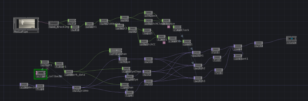 Anyway, after several iterations the script worked! It was my greatest success, and from there, the script gave me channels to send to three separate Crop TOPs for left eye, right eye, and lips. From there, I set up each cropped video and filtered them to positions to place into a Composite.