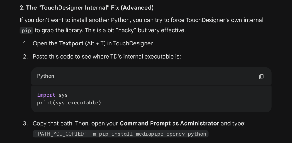 Because none of that worked, I dropped the MediaPipe plugin and used MediaPipe the old fashioned way: by calling the Google model from a python scrip that I placed in TouchDesigner. I had done this before when I wanted MediaPipe without the performance issue. For proper disclosure, I did use Google Gemini 3 to help me write the code for picking parts of the face. I figured if I were using one Google model, why not the other? I went back and forth with the model on debugging the code (can check the whole prompt convo here). AI is not good with TouchDesigner at all, only with code (in my experience). I think this is because TouchDesigner logic is too spatial and visual so it’s much harder to train models with images of cluttered nodes with tons of lines.